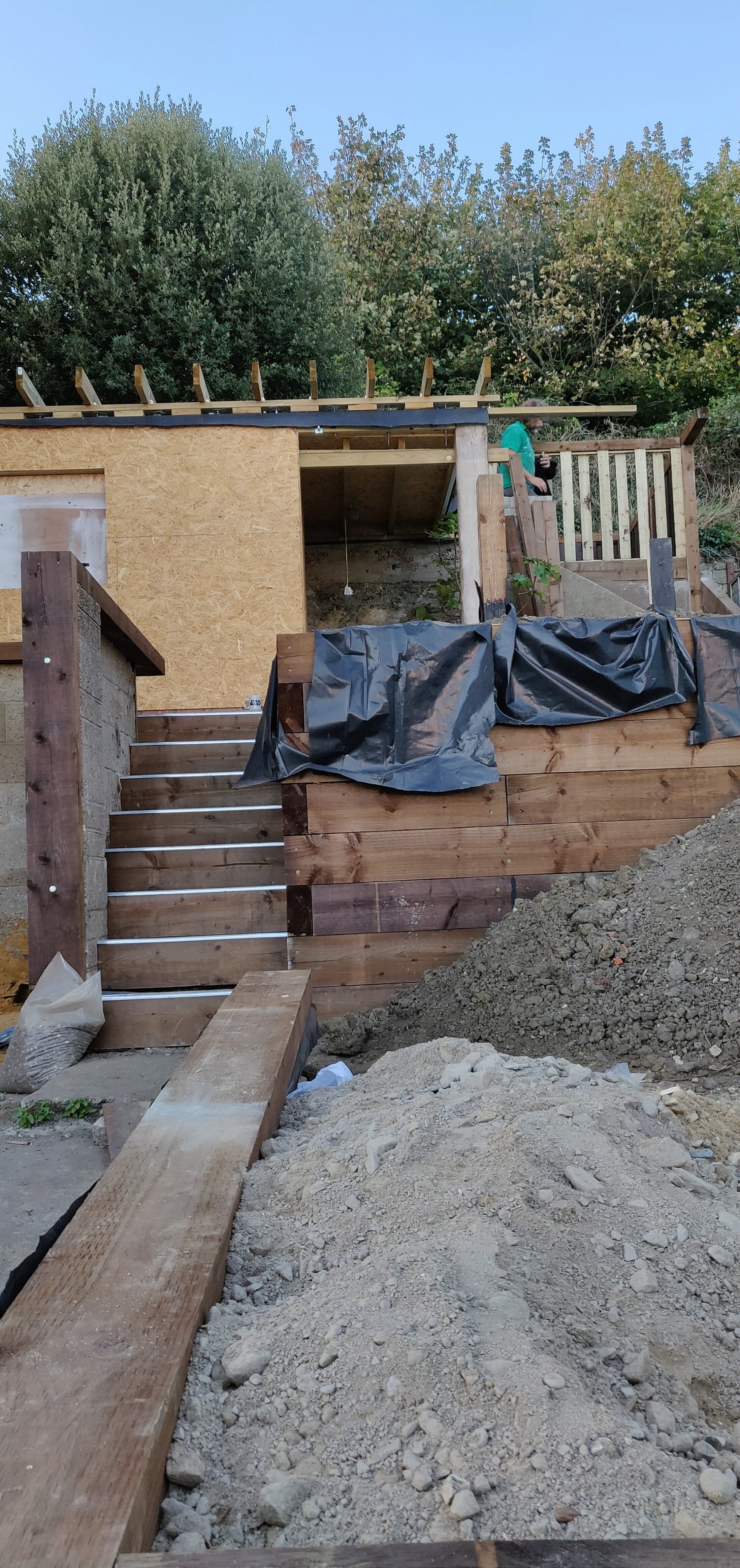 The new shed building underneath the top tier, supports one end of the decking platform and poor soil structure meant a creative solution to the foundation and structural design was needed. Re-cycling earth and rubble by shifting it from one place to another helped to minimise waste. The overall design gave us the scope and flexibility to do that.